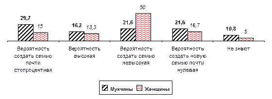 Желания важно соотносить с возможностями. Отношение наличных возможностей к масштабу желанных целей характеризует вероятность достижения этих целей. Какова же вероятность образовать новую семью у наших респондентов – разводящихся мужчин и женщин? Об этом мы у них же и спросили. И вот какие ответы получили (рис. 5.42).