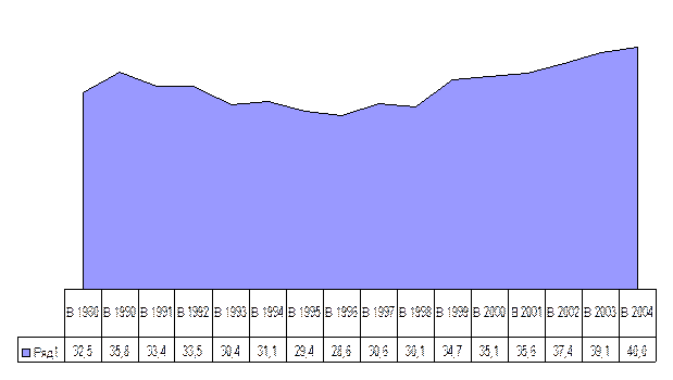 В качестве аргумента в пользу только что высказанного утверждения, имеющего пока статус гипотезы, приведём данные, характеризующие рост процентной доли бездетных браков, начиная именно с 1998 года (рис. 5.44). Расчёт данных произведён автором на основании документов, предоставленных областным Управлением статистики.