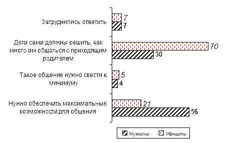 Социологическая действительность опровергла распространённое подозрение в том что женщины, заполучившие в качестве наследства от неудачного супружества ребёнка, будут стараться злоупотребить им для нанесения психологического ущерба бывшим мужьям. За минимальные возможности общения ребёнка с приходящим родителем выступают очень немногие разводящиеся мамы и папы, - всего по 4-5 процентов. Заметим, доля ратующих за минимум такого общения среди разводящихся мужчин и женщин почти абсолютно равна. Мамы более осторожно, чем папы, высказывались относительно режима максимального благоприятствования в контактах ребёнка с приходящим супругом (соответственно, 21% и 56%). Зато почти три четверти (70%) мам доверят свои детям самим решать, встречаться им с живущим отдельно папой или нет.