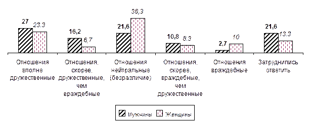 Другая заметная по масштабу группировка только что отвоевавшихся супругов сохранила уважение и, в общем, доброе отношение к противнику. Отношения вполне дружественные по-прежнему испытывают к своим бывшим супругам 27% мужчин и 23,3% женщин. Ещё 16,2% мужей и 6,7% жён, в целом, хорошо относятся к супругам, но ещё помнят былые обиды, нанесённые им в пылу супружеских конфликтов. Всего же в общем позитивное отношение друг к другу сохранили 43,2% разводящихся мужчин и 40% женщин.