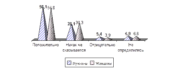 Рисунок 5.47 - Распределение ответов мужчин и женщин на вопрос: «Как сказывается на отношениях полов официальная регистрация брака?», в %
