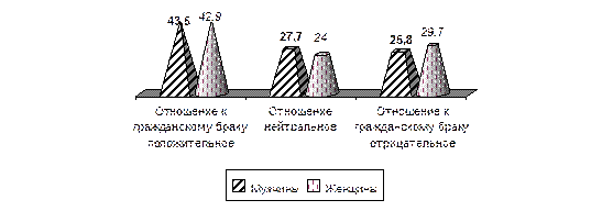 Отношение к гражданскому браку в общественном мнении далеко не однозначное. Если и не абсолютное, то, во всяком случае, относительное большинство мужчин и женщин вполне благосклонно относятся к незарегистрированным в государственных органах супружеским отношениям. То, что сравнительно недавно называли блудом, сегодня 43,2 % наших современников воспринимают в качестве нормы. Даже треть (35%) состоящих в официальном браке мужчин и женщин высказалась положительно по поводу гражданского брака. Правда, остались на нашей земле и моралисты, придающие особое значение в личной жизни мужчин и женщин размытым штампам в их паспортах. Каждый четвёртый (25,8%) среднестатистический мужчина и почти 30% женщин выступают против гражданских браков, оставаясь твёрдыми и последовательными сторонниками официальной регистрации супружеских отношений. Каждый четвёртый из числа участников опроса (25,6%) относится к проблеме гражданского брака безразлично, считая вопрос наличия или отсутствия официальной регистрации интимных отношений мужчины и женщины делом несущественным.