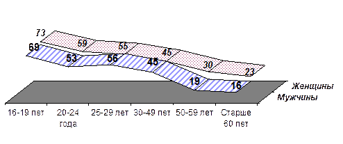 Рисунок 5.49 - Распределение мужчин и женщин, положительно относящихся к гражданскому браку, в зависимости от возраста респондентов (в %)