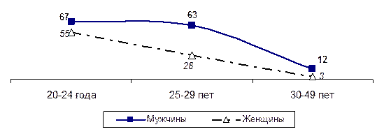 Рисунок 7.1 – Высказанное состоящими в браке мужчинами и женщинами с детьми желание родить следующего ребёнка, в зависимости возраста, в %.
