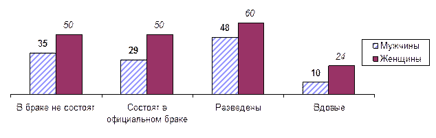 Рисунок 7.4 - Доли мужчин и женщин, положительно относящихся к брачному контракту, в зависимости от семейного статуса, в %