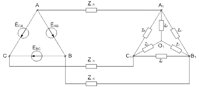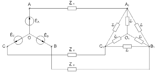 · найти фазные и линейные падения напряжения на эквивалентной нагрузке и в линейных проводах;