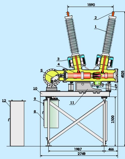энергиясы нөлге дейін баруы мүмкін. Бірақта доғаның кернеуі электрлік құрылғы өткізгіштігіне сенімді жұмыс шарттарына байланысты. Элегазды ажыратып қосқыштар. 110кВ класына арналған ВГБУ сериалы ажыратқыштар. Олар ток трансформаторлары, үшфазалы басқару (з3 фазалы гидропривод) және полярлы кірістер (элегазды ауа) орналасқан. ВГБУ типті элегазды ажыратқыш: 1-кантакты пластина, 2-кіріс, 3-трансформаторлы токтар блогы, 4-өшіргіш құрылғыларү 5-беріліс механизімі, 6-фильтр, 7-газ толтыруға арналған блог, 8-гидропривод, 9-жағдай көрсеткіш.