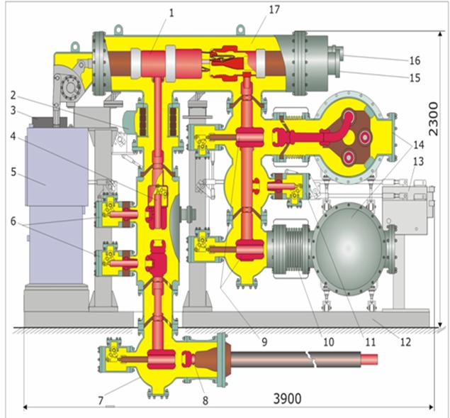 110-500кВ кернеу класына арналған КРУЭ ұяшықтары. 1-ажыратқыш, 2-ток трансформаторы, 3-аппараты шкаф, 4-желі ажыратқыштар, 5-гидропривод, 6-желілік жерлестіру, 7-енгізу кабельнің ажыратқыш, 8-кабельді енгізу, 9-шиналық ажыратқыш, 10-сильфонды компенсатор, 11-шиналық жерлестіру, 11-рама, 13-ажыратқыш пен жерлестіру жетегі, 14-үшфазалы жинақталған шиналар, 15-мембрана, 16-элегазды тығыздығының датчигі, 17-элегаз.