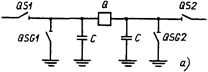 Айырғыштардың жұмыс істеу шарттарынтөменгі үлгіде түсіндіреміз. Жөндеуге арналған ажыратқыш дайындауына ол тиісті сөндірілген болу керек және көршілес бөлімнен бөлектеу, екі айырғыштың арқасында QS1 және QS2 (Сурет.34, а)кернеу түсірілген. Осы жағдайда айырғыштар сыйымдылық тоқты сөндіріп тастайды, жүйедегі кернеу және сиымдылық ажыратқыштың мағнасы анықталады. Бұл ток аз, және айырғыштардың контактілерінде доғалық разряттар пайда болады. Айырғыш ажыратқыштар сөнгеннен кейін Q, жөндеуге жататыны, екі жағымен QSG1 және QSG2 қосымша пышақтарымен желестірілу керек.