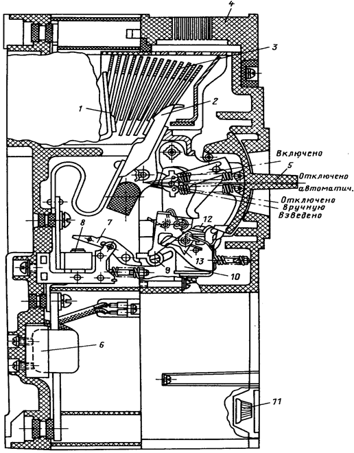 1-саңылаулары бар болат пластина; 4-от өшіргіш; 5-қолымен басқаруға арналған құрал; 6-трансфоматор тоғы; 7-шапшаң әрекет ететі зәкір ағытқыш; 8-жүрекше; 9-сөндіруші білте; 10-тәуелсіз катушка ағытқышы;11-қодырғыны қолымен ретейтін қырал;12-тәелсіз ағытқыш; 13-шаппа.