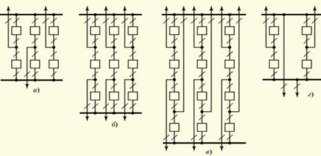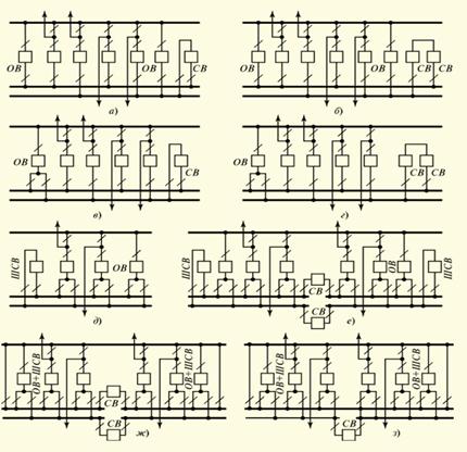 а – бір секцияланған жүйесінің жинақталған шинасының бөлек айнымалы ажыратқыштармен әр секциясына; б – сол сияқты, жүйелі шиналар жиынтығы секцияларған екі тізбектей жалғанаан өшірілген ажыратқыштармен; в – бір секцияланған жүйеләі шиналар жиынтығының айналым ажыратқышының біреуімен; г – сол сияқты, бірақ жүйелі шиналар жиынтығымен, екі тізбектей қосылған ажыратқыштардың секциялануымен; д – екі жүйелі шиналар жиынтығымен; е – сол сияқы, бірақ екі жүйенің шиналар жиынтығының секциялануымен; ОВ – айналып өту ажыратқышы; СВ – секциялы ажыратқышы; ШСВ – шина біріктіргіш ажыратқыш.