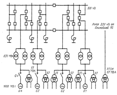 АЭС электрлік сұлбасы КЭС сұлбасынан шамалы ерекшеленеді. Бұл блоктардың бірлік қуатының ескере отырып(1000-1500МВт) технологиялық жобалау нормалары екі еселенген блоктарды АЭС-та қолдану ұсынылмайды. Әр блок станцияның құрама шиналарына жоғарылатқыш трансформаторлар мен бөлек сөндіргіштер арқылы қосылу қажет. ТҚ сенімділігінің жоғары болуына қажетті шаралар қабылдану қажет. Мысал ретінде сурет 47. 1000МВт 4-блокты АЭС-ның электрлік сұлбасы келтірілген. Олардың қуаты бес желілер бойымен торапқа 500кВт беріледі. Әр блокқа екі трансформатордан, жоғарылатқыш трансформатор негізінде 630МВА үш фазалы трансформатор алынған. Төменгі кернеулі жүйені электрмен жабдықтау үшін, төменгі кернеулі орамтар трамақталған жоғарылатқыш трансформаторлармен жүктеме генераторлармен сөндіргіштерінің арасындағы тарамдалған аймақтағы блокқа жалғанған. Алғашқы екі блоктар қуаты 63 және 25 МВА – А, қуатына ие трансформатордан тұрады, үшінші және төртінші блоктар қуаты 63 МВА бір трансформатордан тұрады. Ортаңғы кернеулі қосымша трансформатор қуаты 63 МВА, жақын қашықтықтағы қосалқы станциядан әуе желісі арқылы қоректенеді.