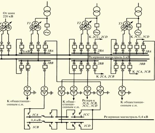 Сұлбасы 7.16 суретте көрсетілген КЭС – те бірінші энергоблоктың 0,4 кВ кернеулі ө.м. тұтынушысы және жалпы станциялық жүктеменің бөлігі 1СА, 1СВ, 1СС және 1СD жарты секциядан қоректенеді. Ең жауапты тұтынушылар секцияның басқа бөліктерінен автоматты сөндіргішпен бөлінген 1СА және 1СВ жарты секцияларына қосылған. Берілген энергоблоктың ө.м. резервті трансформаторы үшінші энергоблоктың 3ВА секциясына қосылған. Кернеуі жүктемемен реттелетін ө.м. трансформаторларын қолдану ө.м. ТҚ шиналарындағы қажетті кернеу деңгейін ұстап тұруға мүмкіндік береді.