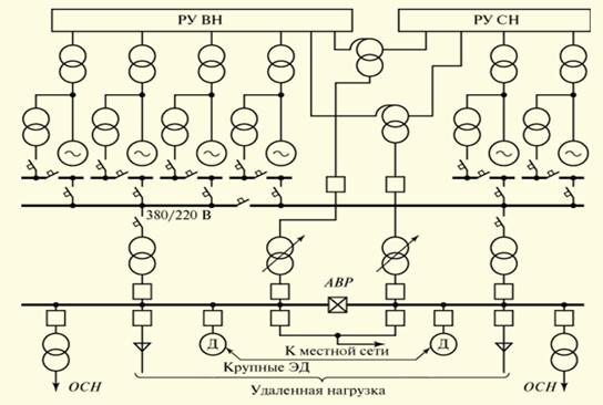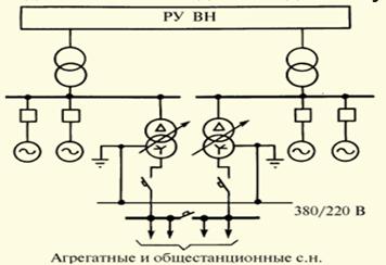 7.18 – суретіне жалпы станциялық және агрегаттық тұтынушылары бөлек қоректенетін үлкен қуатты СЭС-н ө.м. электрмен жабдықтауының сұлбасы келтірілген.