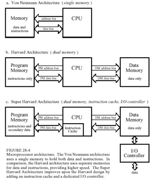 В отличие от этого Гарвардская архитектура (разработана в 40-х годах в Гарвардском университете под руководством Говарда Айкена, Howard Aiken, 1900-1973) предполагает наличие двух раздельных пространств для хранения данных и инструкций и отдельными шинами для каждого из них. Поскольку шины функционируют независимо, инструкция и данные могут быть извлечены одновременно и сокращает количество тактов на обращение к памяти в нашем примере до двух. Такая архитектура используется в большинстве современных ЦСП, возможно с некоторыми модификациями (в частности, Модифицированная Гарвардская архитектура предполагает возможность хранения в памяти команд не только инструкций, но и данных).