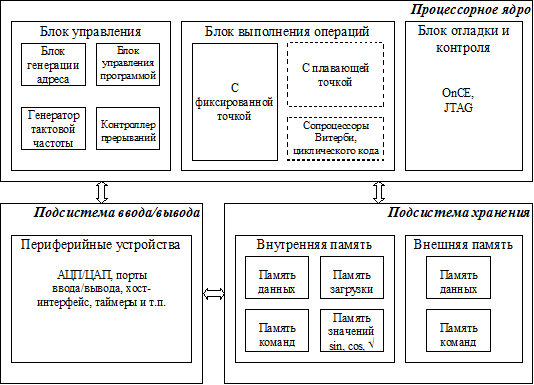 Обобщенная архитектура ЦСП образуется тремя составляющими: процессорным ядром, подсистемами ввода/вывода и хранения (рис.2).