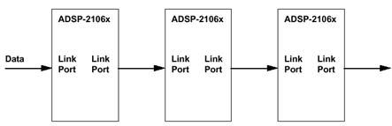 Для устранения ограничений, связанных с использованием общей шины (в каждый момент времени только два ADSP могут обмениваться данными) используются соединения типа "точка-точка" через линк-порты (рис.3). Одновременно на каждом процессоре могут быть задействованы до 6 линк-портов.