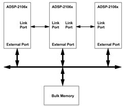 Встроенная логика управления внешней шиной позволяет разделять общую внешнюю шину (без использования дополнительных аппаратных средств) между 6 SHARC-процессорами и хост-процессором.
