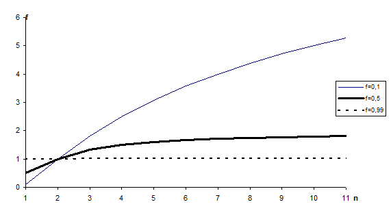Данный закон показывает, что увеличение производительности системы происходит не линейно с увеличением числа процессоров, причем с увеличением доли последовательных операций эта проблема обостряется (рис.6).