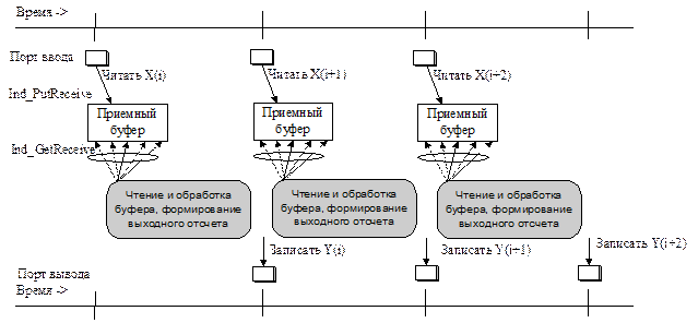 1. По таймеру или сигналу от внешнего устройства вызывается обработчик прерывания, который выводит в выходной порт сформированный на предыдущей итерации выходной отсчет и переносит из входного порта в приемный буфер новый отсчет входного сигнала