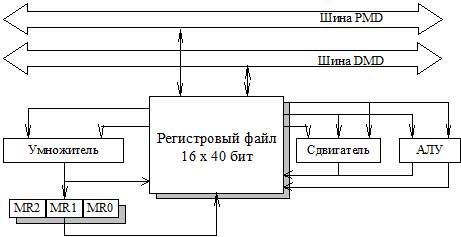Вычислительные блоки получают данные и выдают результаты в регистровый файл (РФ), состоящий из 16 основных и 16 альтернативных (теневых) регистров. Регистровый файл доступен программе и шинам памяти данных для пересылки данных между вычислительными блоками и внешней памятью или другими частями процессора.
