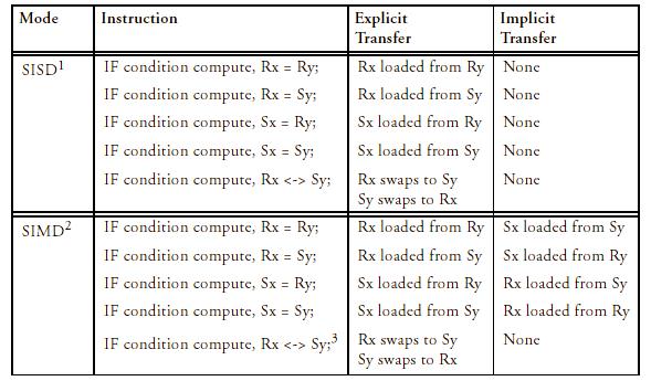 Процессор поддерживает однонаправленные (unidirectional) и двунаправленные (bidirectional) пересылки данных между регистрами двух процессорных элементов в обоих режимах (т.е. регистры PEy можно использовать и в SISD режиме, но только для хранения данных – они не могут являться операндами или приемниками результата для вычислительных инструкций).