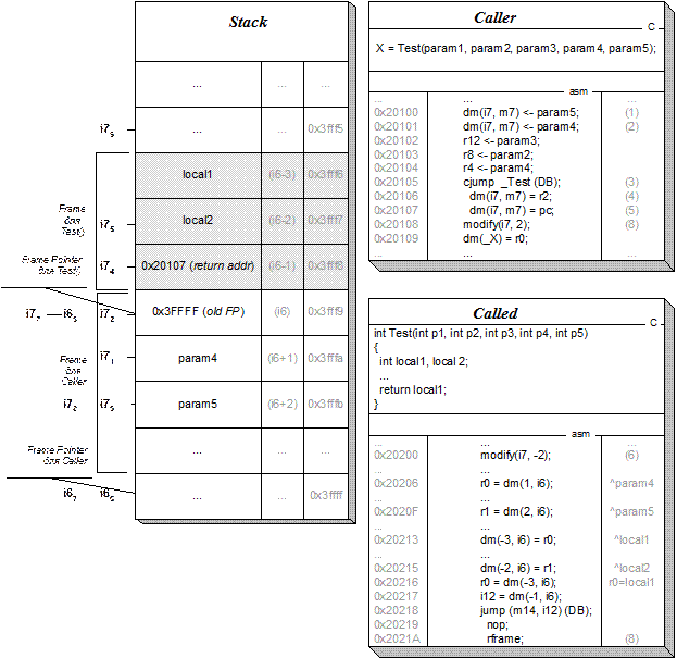 При генерации кода для вызова функции компилятор cc21k формирует код, выполняющий следующую последовательность действий (аналогичную должен формировать программист при вызове из программ на ассемблере любых функций, но обязательно при вызове функций C/C++):