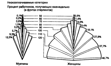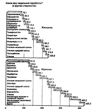 Рис. 5. Уровни оплаты за различные работы в Великобритании в 1986 году. Мужчины и женщины могут получать разную заработную плату, даже если они выполняют одинаковую работу. На втором рисунке показано, что женщины зарабатывают гораздо меньше мужчин: 46% женщин и лишь 13,5% мужчин получают менее 120 фунтов в неделю. Источник: New Society, 24 April. 1987. P. 44
