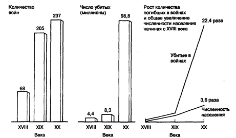 Если говорить о числе потерянных человеческих жизней, становится ясно, что в двадцатом веке человечество было одержимо войной как никогда ранее за всю свою историю. Уже сегодня количество убитых на войне в нынешнем столетии превышает 100 миллионов — в среднем 3500 жизней в день. Большинство этих людей погибло в двух мировых войнах, но в течение всего двадцатого века то в одном, то в другом месте на планете постоянно идет война.