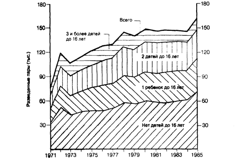 Рис.9. Рост числа разводов в Англии и Уэльсе в 1971-1985 годах с учетом числа детей и их возраста. Источник; Social trends. London, 1987. P. 51