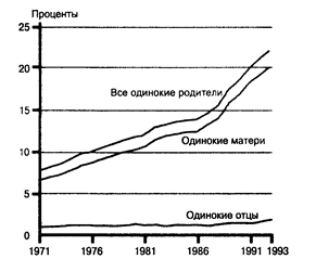 “Семьи с одним родителем” получают все более широкое распространение. Главой подавляющего большинства таких семей является женщина, поскольку, как правило, после развода опеку над детьми получает жена (в незначительной части семей такого рода главой является женщина, которая никогда не состояла в браке). Сегодня в Британии насчитывается более миллиона семей с одним родителем, и число их растет (см. рис.). Такие семьи составляют пятую часть всех семей с несовершеннолетними детьми. Как правило, они относятся к беднейшим группам общества. Многие одинокие матери, независимо от того, были они замужем или нет, по-прежнему сталкиваются с социальным неодобрением и экономической незащищенностью, хотя старые ярлыки, такие, как “брошенные жены”, “безотцовщина” или “разбитые семьи”, постепенно исчезают.