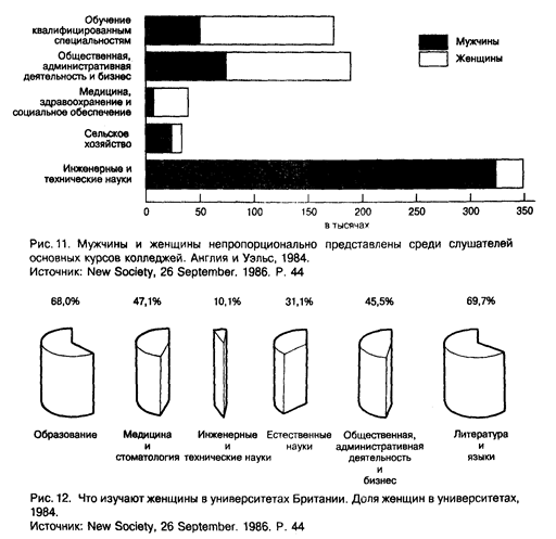 Женские организации в Британии и в других странах часто выступали с критикой дискриминации женщин в системе среднего и высшего образования. Женщин все еще очень мало среди профессорско-преподавательского состава колледжей и университетов. Обзор 454 колледжей и университетов США, опубликованный в 1970 г., показал, что среди руководства этих учебных заведений женщин было не более 8%. Среди профессоров женщин было лишь 10%, среди преподавателей — 25%. В Великобритании в 1981 г. женщин-профессоров было 2%, старших преподавателей — 6%, а предподавателей — 14%18).