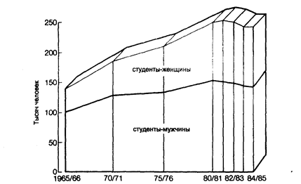 Рис. 13. Число мужчин и женщин в университетах Великобритании (1965-1984). Источник: New Society, 26 September. 1986. P. 44