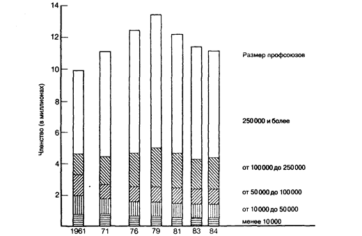 Рис.15. Членство в профсоюзах Великобритании, 1961-1984, по размерам профсоюзов.