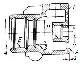 – неперпендикулярность поверхности А относительно общей оси поверхностей Б и В должна быть не более 0,05 мм;