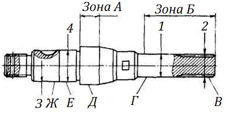 Валик насоса гидроусилителя изготавливают у автомобиля ЗИЛ-130 из стали 30ХГТ, HRC 60…65 в зоне А, в зоне Б HRC 56, не менее.