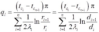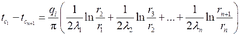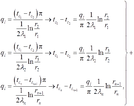В случае многослойной цилиндрической стенки с идеальным контактом между соприкасающимися слоями (выполняются граничные условия четвертого рода), для каждого слоя, если их n, линейную плотность теплового потока можно найти по полученной формуле. Выразив разность температур и сложив полученные значения