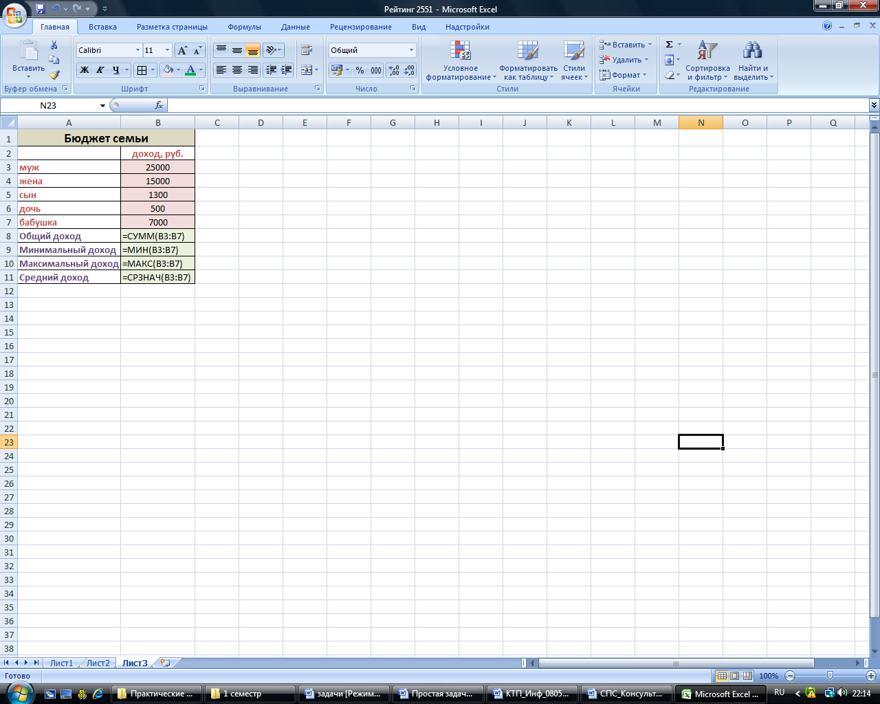 2. На листе1 Задача оформить условие Вашей задачи, ввести исходные данные и произвести необходимые расчеты с использованием стандартных функций: = СУММ(), = СРЗНАЧ(), = МИН(), = МАКС(). Функции вводятся вручную или с помощью команды Формулы/Вставить функцию (или Shift + F3).