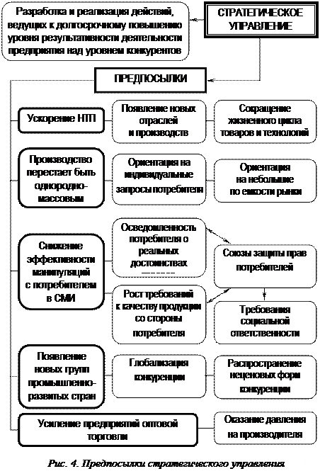 Предпосылки стратегического управления представлены на рис. 4. Выделенные предпосылки демонстрируют тот факт, что внешняя среда фирмы стала на порядок сложнее и непредсказуемее. Это потребовало разработки концепции и инструментов стратегического управления, позволяющих решить стоящие перед фирмой задачи в условиях неопределенности внешней среды.