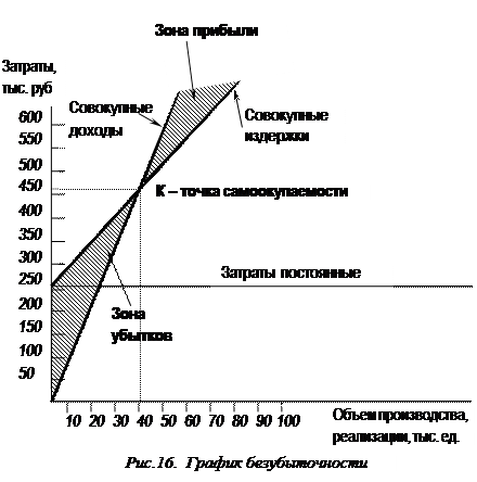 В условиях многовариантности цен и затрат оптимально графическое изображение, которое и представляет собой график безубыточности (рис. 16).