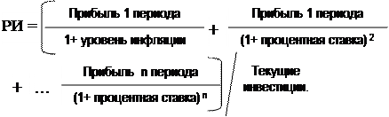 Рентабельность инвестиций. Показатель рентабельности инвестиций (РИ), рассчитывается как отношение общей накопленной величины дисконтированных доходов (чистая приведенная стоимость без значения текущих инвестиций), отнесенная к размеру инвестиций, т.е.: