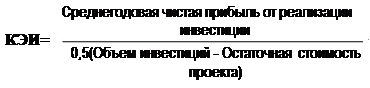 Коэффициент эффективности инвестиций (КЭИ). Данный коэффициент определяется по показателю «чистой прибыли» (балансовая прибыль за минусом платежей в бюджет, осуществляемых из прибыли). При расчете не производится дисконтирование дохода. Таким образом КЭИ определяется по формуле: