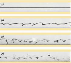 а) – ламинарный режим движения; б) – переход к турбулентному потоку; в) и г) – различные формы развитого турбулентного течения
