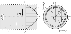 , что соответствует одномерному течению. На некотором расстоянии от входа в нее, где поток уже сформировался (стабилизировался), выделим отрезок длиной l между сечениями 1-1 и 2-2.