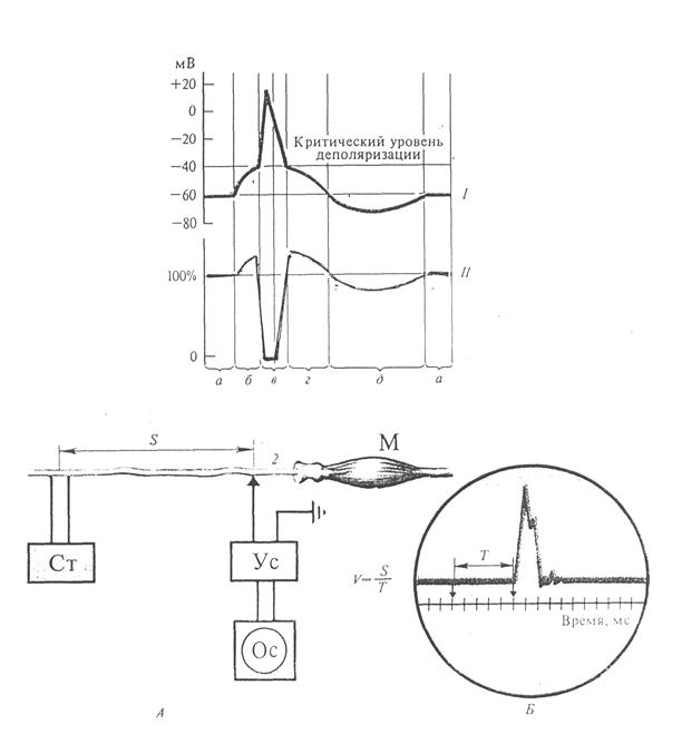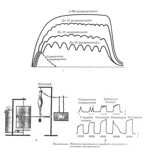 Б – кривые мышечных сокращений при различной частоте раздражений.