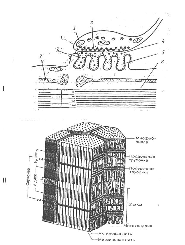Рис.9.Строение волокна и миофибриллы в покое и при сокращении: