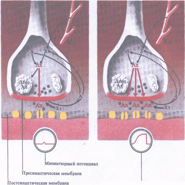 Рис. 8. Синаптические процессы в невозбужденном и возбужденном синапсах (по Л. Щельцыну,