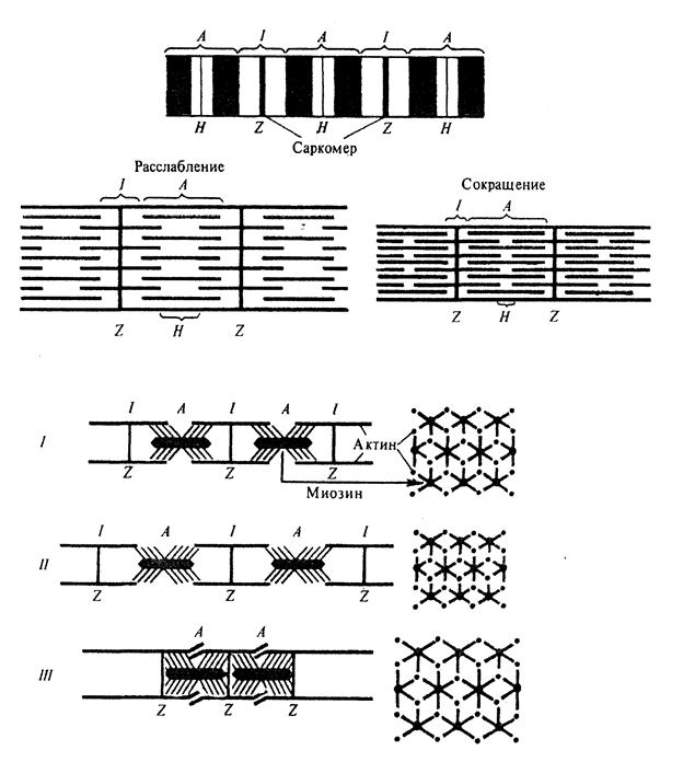 А – анизатропные диски; J изотропные диски; I – расслабленная миофибрилла; II – растянутая миофибрилла; III – сокращенная миофибрилла; слева – продольное расположение нитей, справа – поперечное сечение
