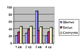 7. Диаграмма элементтеріне (жақтаулары, қатарлары, мәндер өсі, категориялар өсі, тор сызықтары т.б.) «тышқан» манипуляторының курсор көрсеткішін апарып, сол жақ батырмасын шерту арқылы еркшелеңіз. «Тышқан» манипуляторының оң жақ батырмасын шертіп, диаграмма элементтердің жанама мәзірін шақырып, олардың әрқайсысын үлгіге сәйкес жекелей баптаңыз.