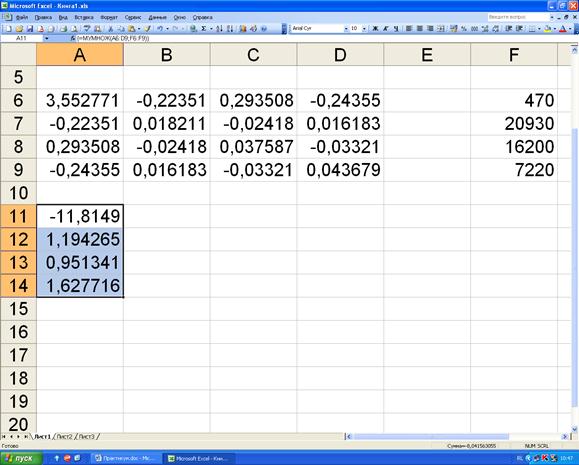 Далее одновременно нажимаем клавиши «Ctrl», «Shift» и «Enter». На рисунке 4.5 представлен результат расчёта коэффициентов модели.